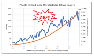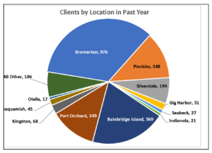 KC HELP clientele encompasses the entirety of Kitsap County and, in some cases well beyond. We have reached people as far north as Marysville, Port Angeles to the west, Seattle to the east, and Vancouver, WA to the south. As expected, our presence in Bremerton at St. Vincent de Paul allowed us to expand our reach further into Gig Harbor, Belfair, and Shelton while we saw significant growth in Central and South Kitsap.